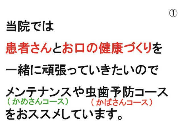 普段より、お口の環境を整えていただくことを推奨しています。そのため、かばさんコース、かめさんコースに入っている患者様と入っていない患者様では、順番の流れが変わります。