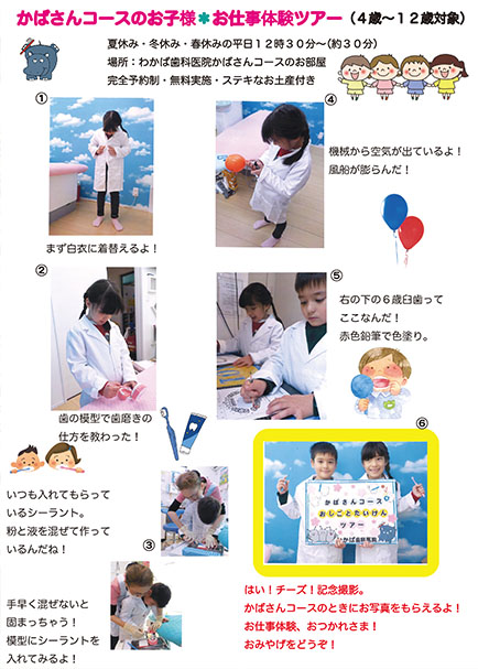 オプションで、前歯のサホライド代わりのドックベスト療法や臼歯の隣接面、むし歯予防の S-PRG を実施しています。お子様に自分の健康に関心をもってもらえるようにお仕事体験を実施します。