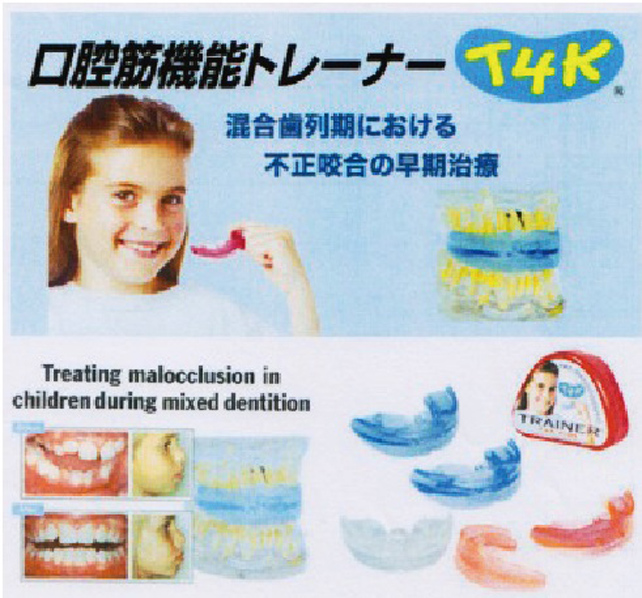 T4Kという装置を利用し、口腔筋の訓練をします。これにより歯と顎の位置の改善を行います。正しい顔の発育や、顎の発達、正常な歯列の発達をサポートするためには間違った舌位置や口呼吸、舌の突き出しのような状態、異常な飲み込みなど、筋機能癖を正してあげることが重要です。T4Kは子供の成長段階(混合歯列期)、永久歯に萌え変わる交換期に装着し、正しい発育を促す最も効果的な装置です。装置を使うことで歯並びがよくなってきます。