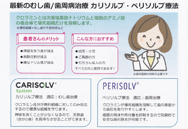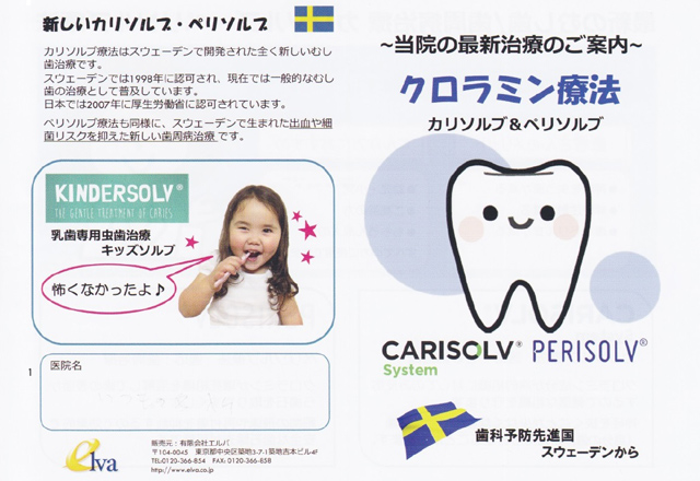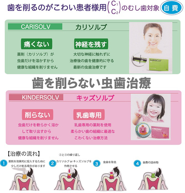 カリソルブ治療は、神経に触れることがない虫歯治療です。スウェーデンでは1998年に認可され一般的な虫歯の治療として普及しています。日本では2007年に厚生労働省に認可された新しい虫歯の治療技術で「痛みを伴わない虫歯治療」です。強い殺菌力のある薬剤を使用します。6歳臼歯の形成不全歯などに最適で、タービンを使用しませんので怖がりなお子さまでも安心して治療を受けていただけます。