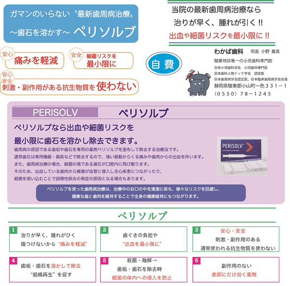 歯周病の原因である歯垢(プラークまたはバイオフィルム)や歯石を専用の薬剤ペリソルブを塗布して除去する治療法です。歯垢とは、歯の表面と歯と歯ぐきの境目(歯周ポケット)に付着する雑菌の塊で、さらに硬く固まった歯垢が歯石となります。歯石は専用機器(エアスケーラーや超音波スケーラー)で振動を与えて除去するので、強い振動や痛み・歯ぐきからの出血が伴います。また、通常の歯周病治療の場合、細菌の塊である歯石が口内に飛び散ります。そのため、出血している歯ぐきから雑菌が血管に侵入し、全身の疾患につながったり、細菌を吸い込むことで誤嚥性肺炎の発症の原因となるリスクも伴います。