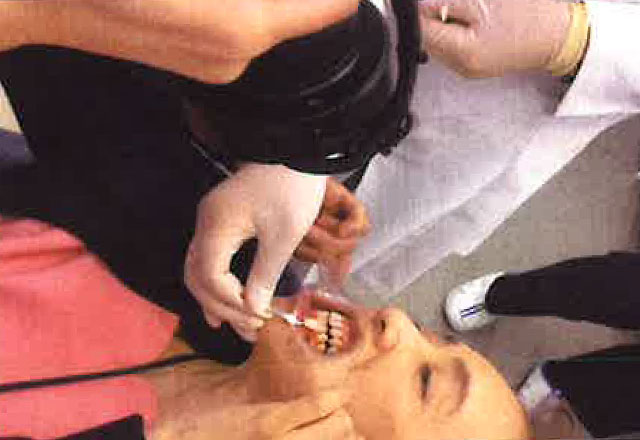 - 前歯の前面に接する部分にジェルを3mmほど出して付けます。トレーからはみ出さないようにご注意ください。